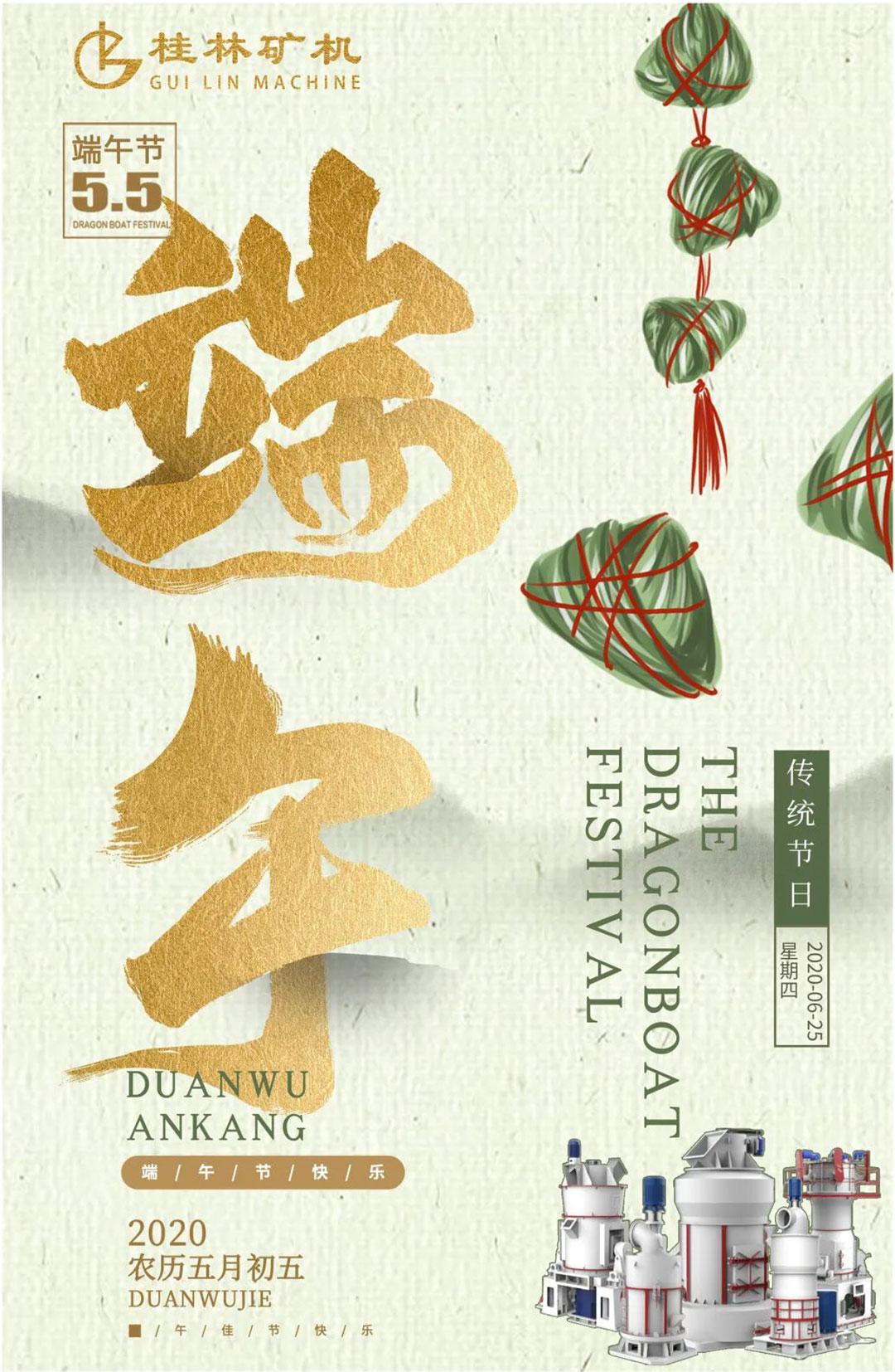 值此端午佳節(jié)之際,桂林礦機(jī)真誠(chéng)感恩每一個(gè)新老客戶(hù)朋友!向所有新老客戶(hù)朋友、全體桂礦家人們送上節(jié)日祝福,祝大家:端午安康!