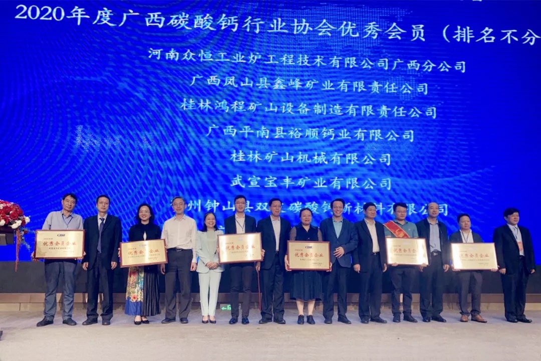 桂林礦機(jī)作為礦山機(jī)械的重要一員,公司從第一屆開始積極參與協(xié)會會議會展,公司領(lǐng)導(dǎo)也非常支持協(xié)會各項工作并投身綠色發(fā)展道路。會中,公司領(lǐng)導(dǎo)肖文輝獲得2020年度廣西碳酸鈣行業(yè)優(yōu)秀企業(yè)家,同時公司還榮獲了廣西碳酸鈣行業(yè)協(xié)會優(yōu)秀會員獎。