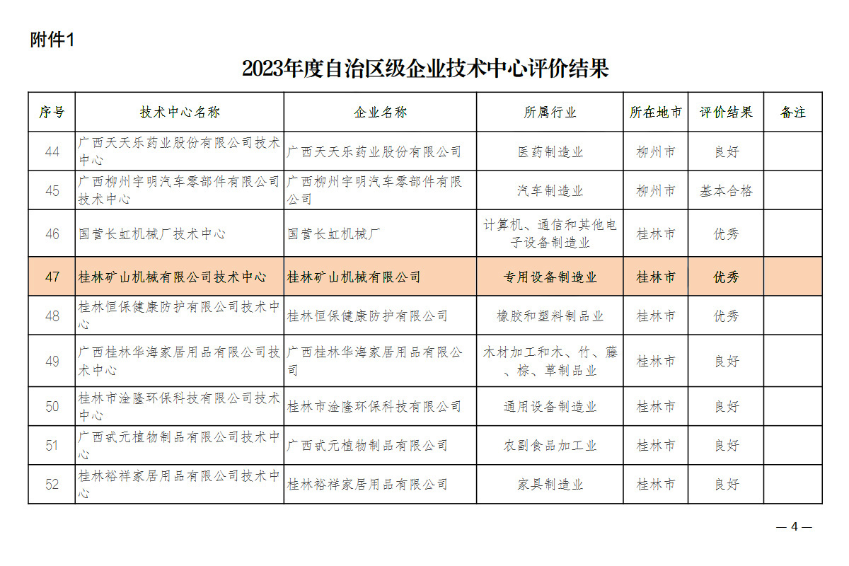 6月27日,自治區(qū)工業(yè)和信息化廳公布2023年自治區(qū)級企業(yè)技術(shù)中心評價結(jié)果的通知,根據(jù)《廣西壯族自治區(qū)認(rèn)定企業(yè)技術(shù)中心管理辦法》(桂工信科技〔2018〕228號)有關(guān)規(guī)定,對2017年、2019年、2021年獲認(rèn)定的自治區(qū)級企業(yè)技術(shù)中心組織開展了復(fù)核評價,符合此次評價年限的自治區(qū)級企業(yè)技術(shù)中心共有94家,其中89家提交了評價材料,5家企業(yè)技術(shù)中心因經(jīng)營困難或者企業(yè)重組等原因申請暫緩評價。89家提交材料的企業(yè)技術(shù)中心評價結(jié)果:優(yōu)秀(90分以上)27家、良好(65-90分)53家、基本合格(60-65分)9家。桂林礦山機(jī)械有限公司憑借在科技創(chuàng)新能力、新產(chǎn)品研發(fā)等方面較大的優(yōu)勢,以優(yōu)秀成績通過2023年復(fù)核評價。
