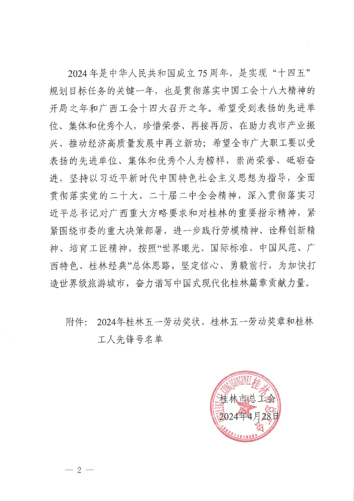 為表?yè)P(yáng)先進(jìn)、樹(shù)立榜樣。近日,桂林市總工會(huì)發(fā)文關(guān)于表?yè)P(yáng)2024年桂林五一勞動(dòng)獎(jiǎng)和桂林工人先鋒號(hào)的通報(bào),決定授予唐義廷等49名職工桂林五一勞動(dòng)獎(jiǎng)?wù)隆?